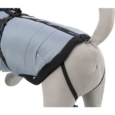 De Trixie Hondenjas Pontis Met Tuig Grijs 45 cm is een handige jas met kraag voor de hond die waterafstotend is, met een geïntegreerd tuig.